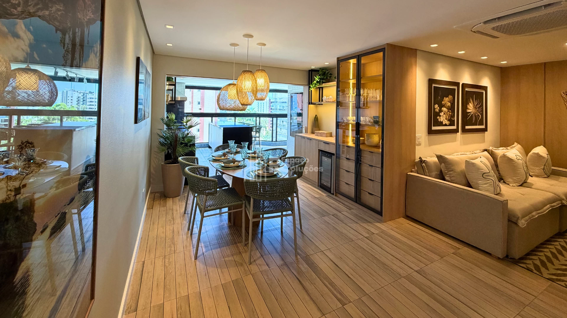 Sala integrada à varanda ficou charmosa
