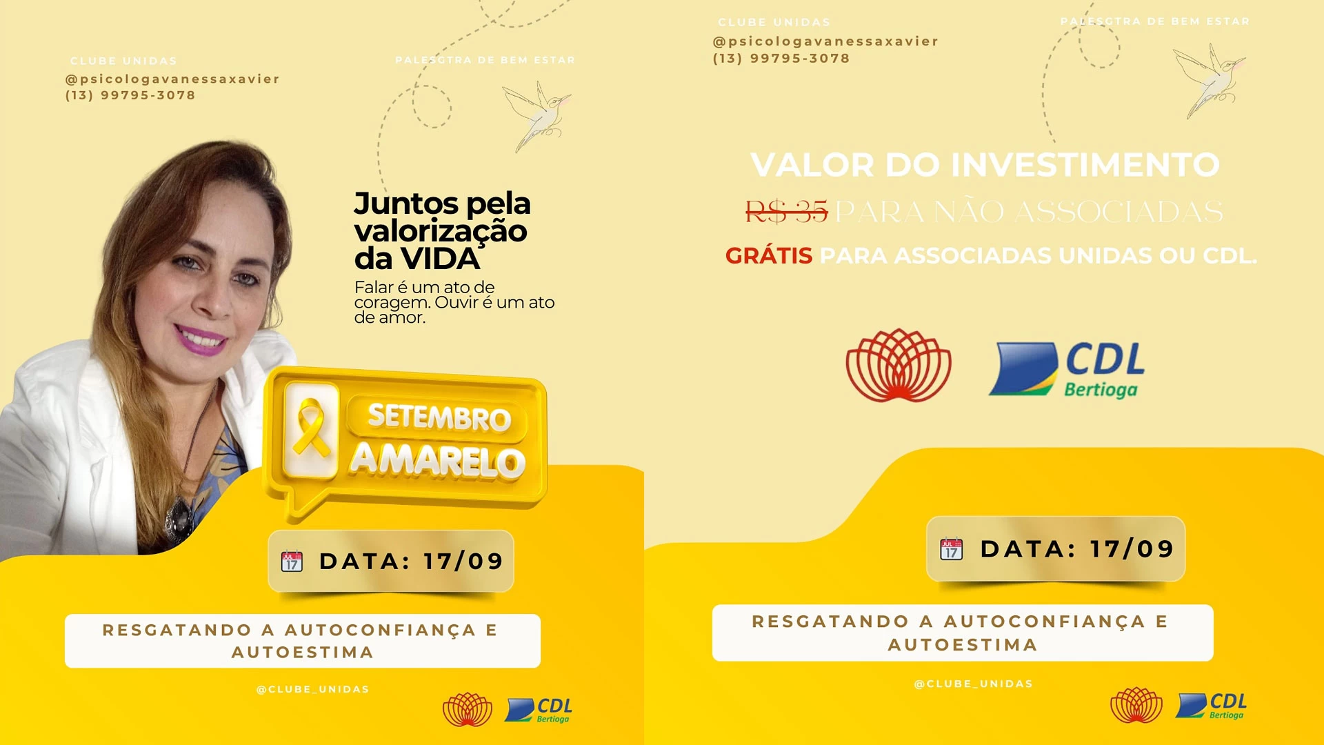 Em alusão ao Setembro Amarelo, no dia 17/09 estarei na CDL Bertioga para uma palestra e workshop com o tema: