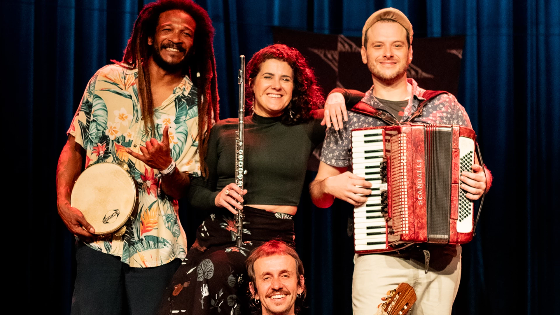 Formado por Camila Latenek, Leandro Xis, Lucas Jardim e Paulo Santos, o quarteto traz ao público um repertório que celebra o Choro, gênero musical reconhecido em 2024 pelo Iphan como Patrimônio Cultural e Imaterial do Brasil. A apresentação reúne instrumentos como flauta transversal, pandeiro, acordeon, cavaco e violão de seis cordas, além da participação especial de Cadu Barros, que integra o espetáculo com violão de sete cordas e cavaco.